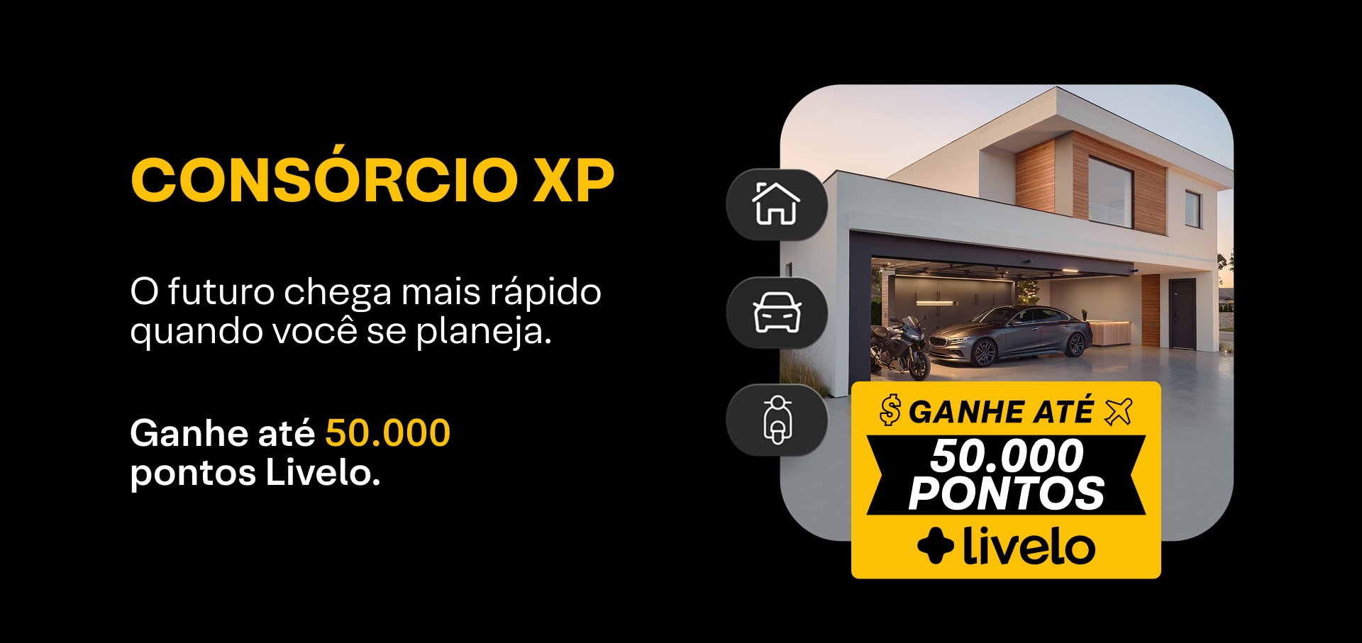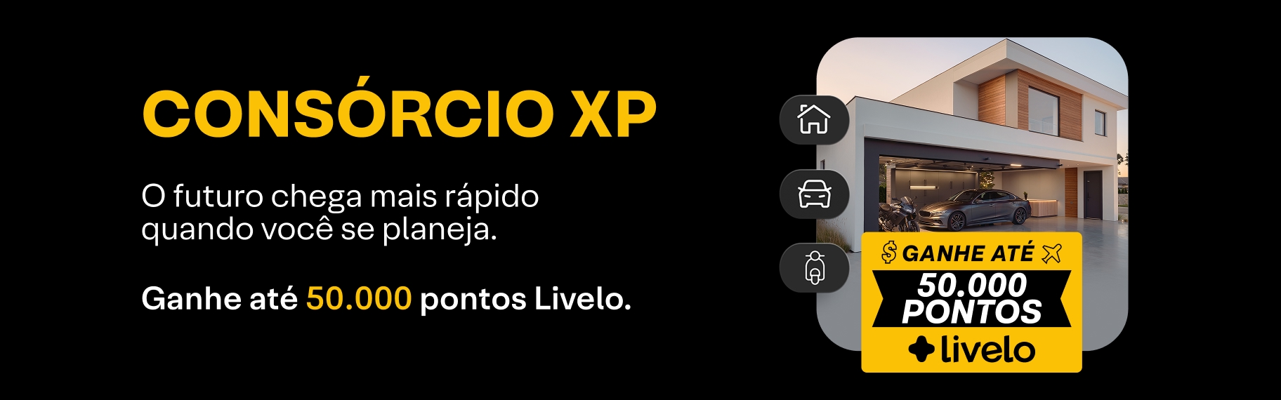 Com o Consórcio XP, você conquista seu bem sem entrada, sem juros e agora ganhando até 50.000 Pontos Livelo.