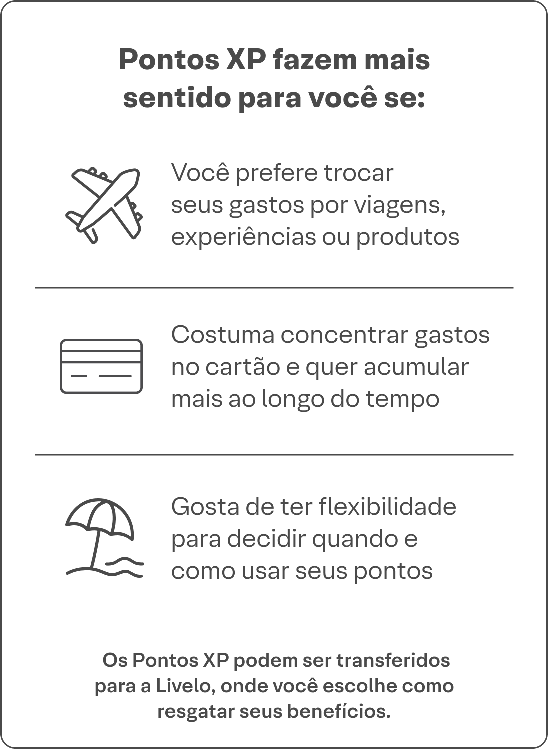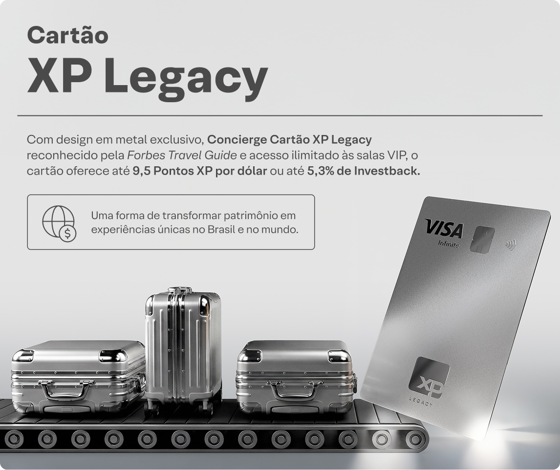 Ao utilizar o seu Cartão XP na função crédito, você acumula pontos que são creditados no seu saldo de Pontos XP após a confirmação do pagamento da fatura. Esses pontos podem ser transferidos para a Livelo e trocados por benefícios como passagens aéreas, hospedagens, aluguel de veículos, pacotes de viagem e outros produtos e serviços disponíveis na plataforma, conforme regras do “Programa de Pontos Livelo”. Para utilizá-los, é necessário ter cadastro ativo na Livelo.