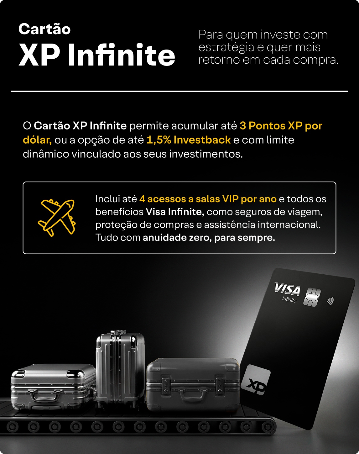 Se tiver a portabilidade de salário para XP, o benefício passa a ser contínuo: 1,5% de Investback ou 3 Pontos XP por dólar gasto, válido em todas as faturas enquanto a portabilidade estiver ativa.