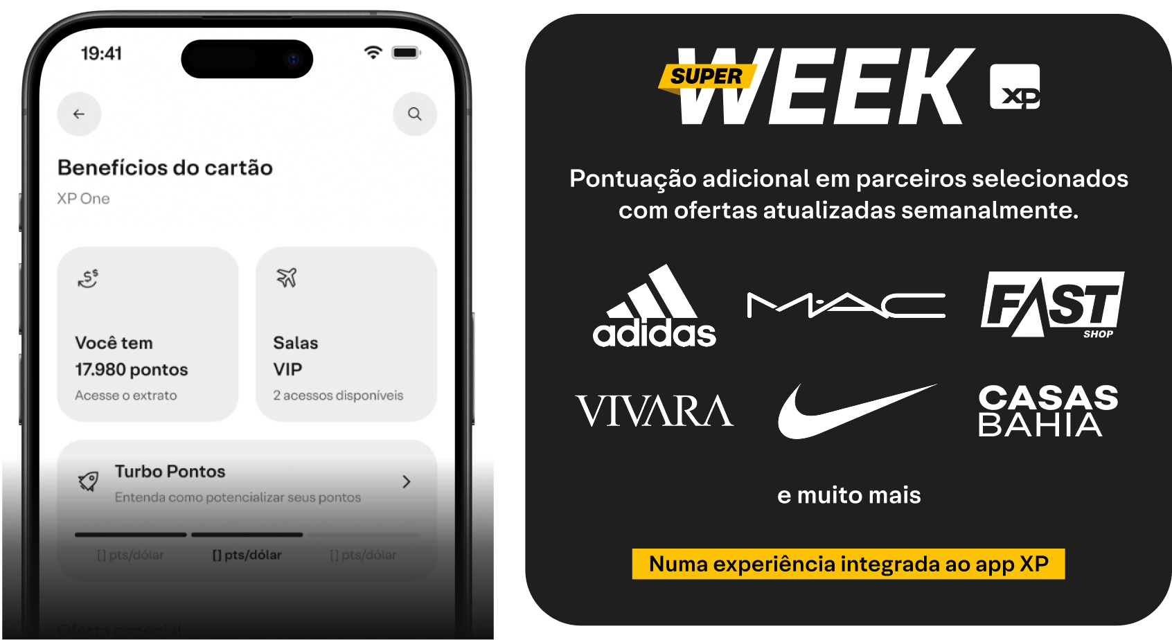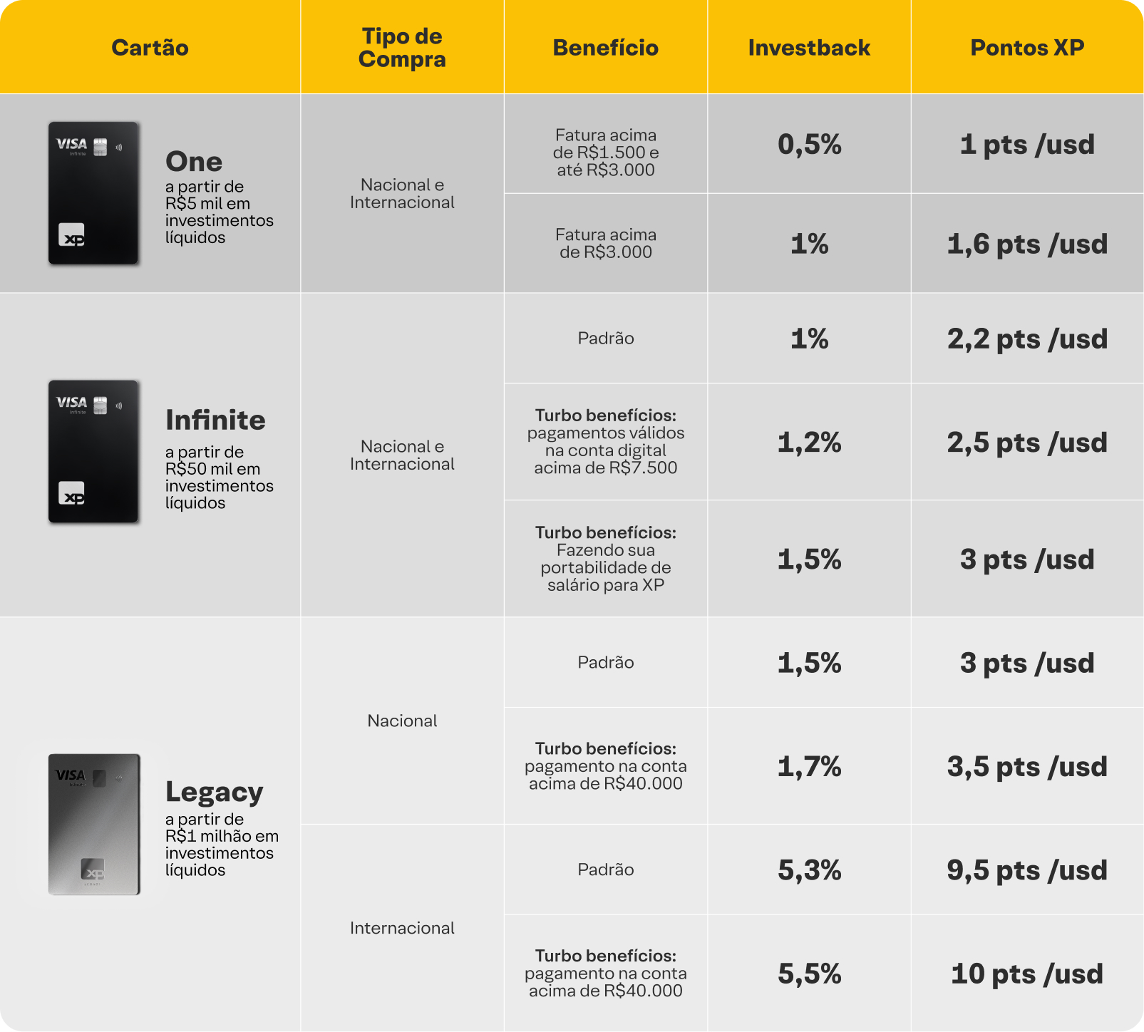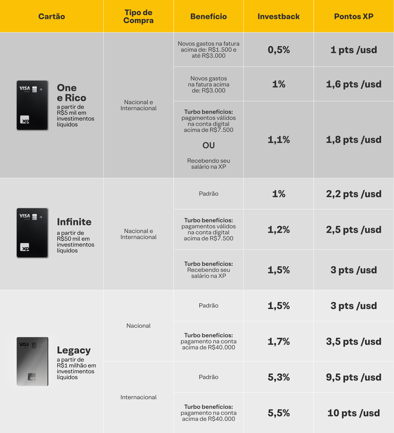 O Turbo Benefícios é uma funcionalidade do App XP que permite aumentar o percentual de Investback ou a pontuação de Pontos XP nos Cartões XP Infinite e XP Legacy ao atingir determinados valores em pagamentos válidos realizados na sua Conta Digital XP.
