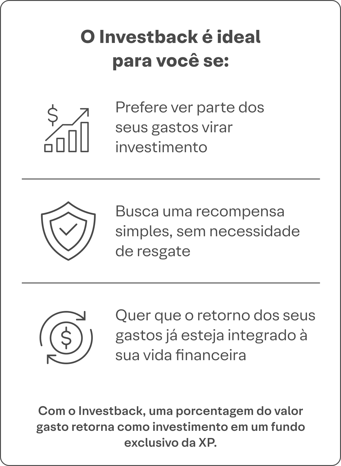 O Investback XP é um benefício do cartão de crédito XP que pode devolver parte do valor gasto em compras elegíveis na função crédito. Esse valor fica acumulado até atingir o valor mínimo de R$50, quando é automaticamente convertido em um fundo exclusivo de renda fixa com liquidez diária. Diferente do cashback tradicional, o Investback incentiva o investimento contínuo com possibilidade de rendimento.